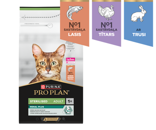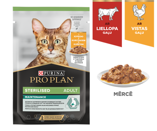 Uzturam ir būtiska nozīme sterilizētu kaķu optimālas veselības uzturēšanā visos dzīves posmos. PURINA® PRO PLAN® piedāvā dažādus kvalificētu speciālistu izstrādātus un uzturvielu ziņā sabalansētus barības veidus, kas paredzēti sterilizētu kaķu īpašajām uztura vajadzībām.